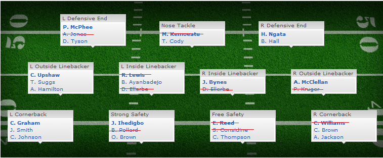 Pour gagner le titre, les Ravens ont pu compter sur des lignes arrières toujours compétitives. Formées de Bernard Pollard, Ed Reed et James Ihedigbo (entre autres), les Ravens ont commencé par prolonger le dernier nommé. Ce qui n’augure rien de bon pour les deux premiers. Et pour cause, le lendemain Pollard était coupé de l’effectif des Ravens. Non pas que son salaire de 1M$ était trop important pour la franchise, mais probablement que le front office a un rookie en ligne de mire.