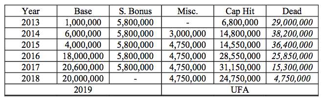 On ajoutera que le joueur reçoit également un bonus à la signature de 29 M$. Toujours bon à prendre. Donc pour l’année prochaine, le joueur n’impactera la masse salariale de sa franchise « que » de 6.8 M$. Mais en 2017, il en sera autrement puisque le quartarback prendre à lui seule quasiment un quart des salaires. Les Ravens ont donc choisi d’offrir un contrat longue durée progressif, au cours duquel le salaire du joueur gonflera. C’est sans doute une solution justifiée pour un poste aussi exposé et pour un joueur qui malgré tout n’a pas toujours été irréprochable. Rappelons-nous que l’année dernière, les Bills signaient un gros chèque à Fitzpatrick après une saison pleine d’espoir. Ils l’ont coupé il y a quelques jours. Mais il comptera néanmoins dans la masse salariale de Buffalo malgré le fait qu’il n’y joue plus. C’est ce qu’on appelle la « dead money ». En ce qui concerne Flacco, elle est plutôt importante et devrait refroidir bons nombre de fans si Flacco ne confirmait pas tous les espoirs placés en lui.