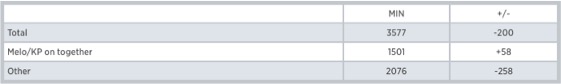 Comment expliquer alors les résultats décevants de l’équipe ? Tout d’abord Carmelo Anthony n’est pas LeBron James, ni même Chris Paul. Il n’est pas capable de gagner 50 matchs en saison régulière avec une armée de rôle players, et d’ensuite porter cette équipe en playoffs. Melo a réellement besoin d’aide sur le terrain, d’avoir un vrai lieutenant capable de le soulager, notamment au scoring. Dans ce domaine on peut dire qu’il n’a jamais été vraiment aidé depuis son arrivée à New York. Cette saison Arron Afflalo est bien trop irrégulier pour être une solide deuxième option, Porzingis a beau avoir dépassé les attentes il ne reste qu’un rookie, et Robin Lopez est un joueur bien trop limité offensivement pour endosser ce rôle à plein temps. Cependant, son duo avec le letton est plutôt efficace, comme nous le prouve ces statistiques :
