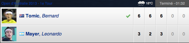 Vainqueur du tournoi de Sydney sans jamais concédé son engagement, Bernard Tomic faisait son retour sur l’Open d’Australie où il s’était révélé en 2011 en tenant tête au numéro 1 mondial, Rafael Nadal et où il atteint les huitièmes de finale l’an passé. Pour son entrée en lice dans cette édition 2013, il héritait de Leonardo Mayer comme adversaire. Il n’en fit qu’une bouchée. Surfant sur sa victoire à Sydney, il marcha sur son adversaire. L’australien remporta 90% des points disputés derrière sa première balle, ne concédant aucune balle de break à l’argentin. En une heure et demie de jeu, il breaka 4 fois un Mayer dépassé.